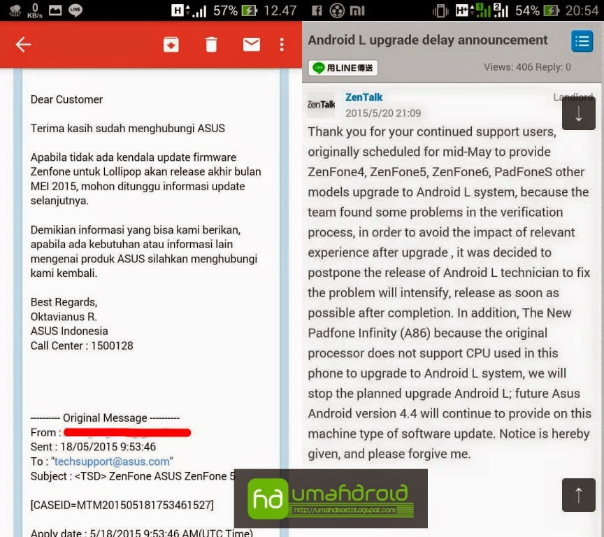 Namun ini hanya kemungkinan dan pendapat. Tidak menutup kemungkinan ada faktor lain dibalik delay itu dari ke-2 alasan yang terlulis diatas. Setelah hari lalu juga sempat digegerkan dengan munculnya 203.72.63.20/~309/ berisi countdown dari update Android Lollipop untuk ASUS Zenfone 4,5,6. Grup, forum dan social media dibuat ramai oleh kejadian ini. Namun sayangnya kejadian tersebut hanyalah berita HOAX. Dengan adanya kejadian ini, ASUS angkat bicara dengan mengkonfirmasi jikalau kejadian tersebut bukan dari mereka. Beberapa teman di grup facebook menyempatkan untuk menghubungi pihak ASUS perihal kejelasan update Android Lollipop yang sudah sangat ditunggu-tunggu. Berkut adalah screenshot dari email dan forum Zentalk :