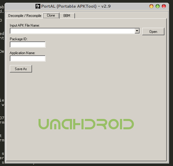 Kita mulai dari sedikit perkenalan dengan tools yang digunakan. Portable APK Tool pada versi ini mempunyai 3 buah tab. Dari ketiganya, setiap tab mempunyai fiturnya masing-masing. Tab pertama digunakan untuk decompile dan compile+sign apk, tab ke kedua digunakan untuk clone aplikasi, dan pada tab yang ketiga digunakan untuk modding BBM. Sobat bisa buka-buka sendiri dari ke-3 tab tadi. Screenshot dari aplikasinya seperti dibawah ini :
